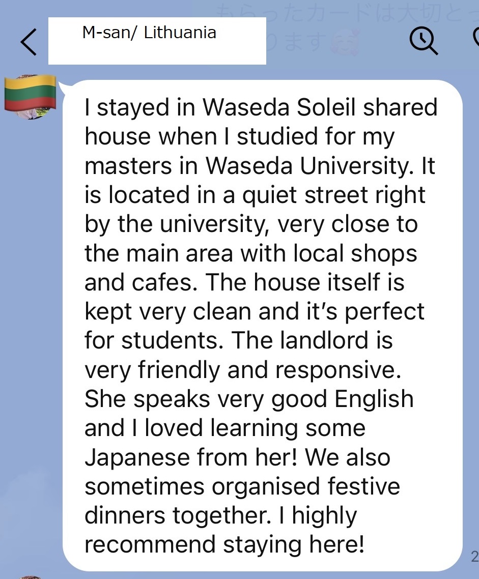 Soleil Waseda is not just a place to live – it is truly a space where people can form a new community while experiencing life in Japan. There are five private rooms on the second floor of the complex which make up the sharehouse. The rooms allow complete privacy, yet there are still opportunities to socialize with other sharemates in the common area, where people can hang and gather. The owner, Naoko, lives on the first floor, so she can assist you when you need help!